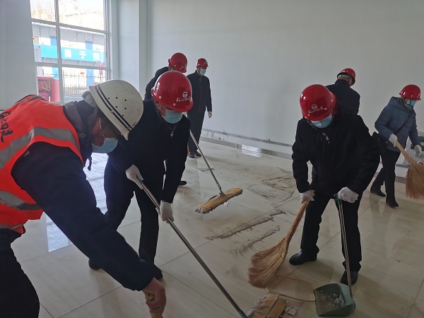 一到现场,党员们就摩拳擦掌、跃跃欲试。项目经理首先向孙长虹一行简单介绍了项目基本情况和现场安全注意事项后,省直工会的党员们就戴上安全帽,直奔辅助工房三区。他们手持拖布、笤帚在一层室内清理地板砖、整理杂物、倒运垃圾,干得热火朝天。大家不顾室内的灰尘,认真地清理着地面上的杂物、清扫着每个角落。经过紧张工作,党员们把三区一层房间和走廊打扫得干干净净,把装饰材料、防水材料等杂物码放得整齐有序。现场工人看到党员们不怕脏,不怕累的劳动,都纷纷称赞。劳动结束,在业主的带领下,孙长虹、李怀生等党员参观了已经完工、正在试运行的制梗生产线。