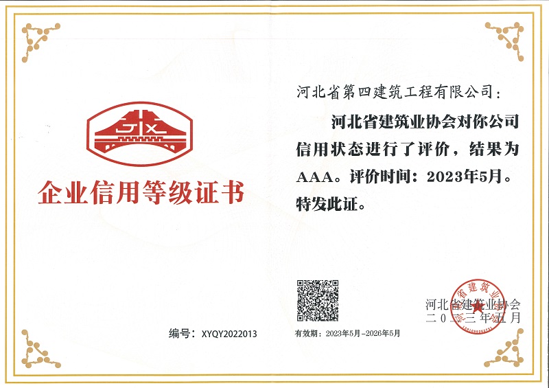 公司自成立以来,始终注重诚信机制建设,坚持贯彻诚信经营理念,以诚信彰显国企担当,在河北四建领域取得了明显成效连续多年荣获河北省建筑业协会、中国建筑业协会、中国施工管理企业协会的“AAA级信用企业”,以及中国建设银行“AAA信用等级”国家税务总局“纳税信用A级企业”、河北省建设工程招标投标协会招标投标诚实守信5A级施工企业等荣誉称号,公司形象和社会美誉度不断提升。(综合办公室)